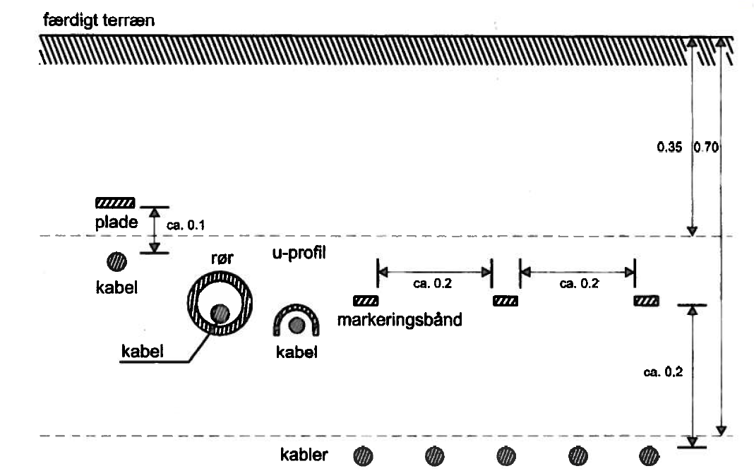 Snittegning af placering af kabler, dækbånd, plader og markerings-bånd ved installation i jorden.