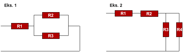 I den første kreds, sidder R2 og R3 parallelt og skal derfor behandles som en parallel forbindelse. For at finde den samlede modstand for kredsen skal du altså starte med at lægge de to modstande sammen før du kan komme videre: