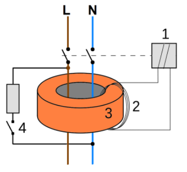 Illustrationen herover viser en forsimplet udgave af en 1-faset RCD.