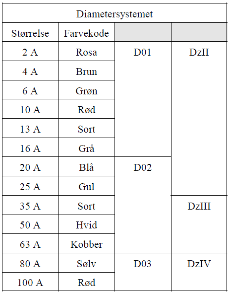 Skemaet viser også hvilke farvekoder der er tilknytte de enkelte sikringsstørrelser. Ekempelvis er en 10A sikring markeret med RØD, mens en 16A er markeret med GRÅ.